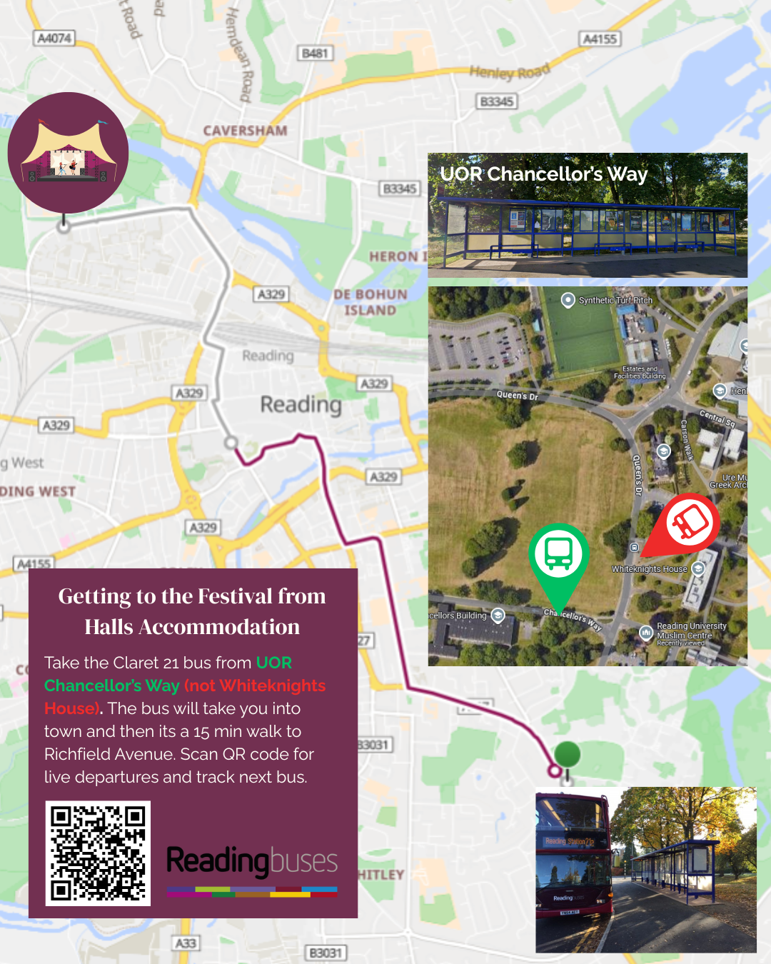 Explore the option of traveling to and from the festival by bus, with regular bus services which stop directly on campus you can find out further information on the Reading Buses website. You may also find the campus bus stop locator helpful. To check departure information for the busses back into town, please use the UOR Chancellors Way bus stop (https://www.reading-buses.co.uk/stops/039027900001)